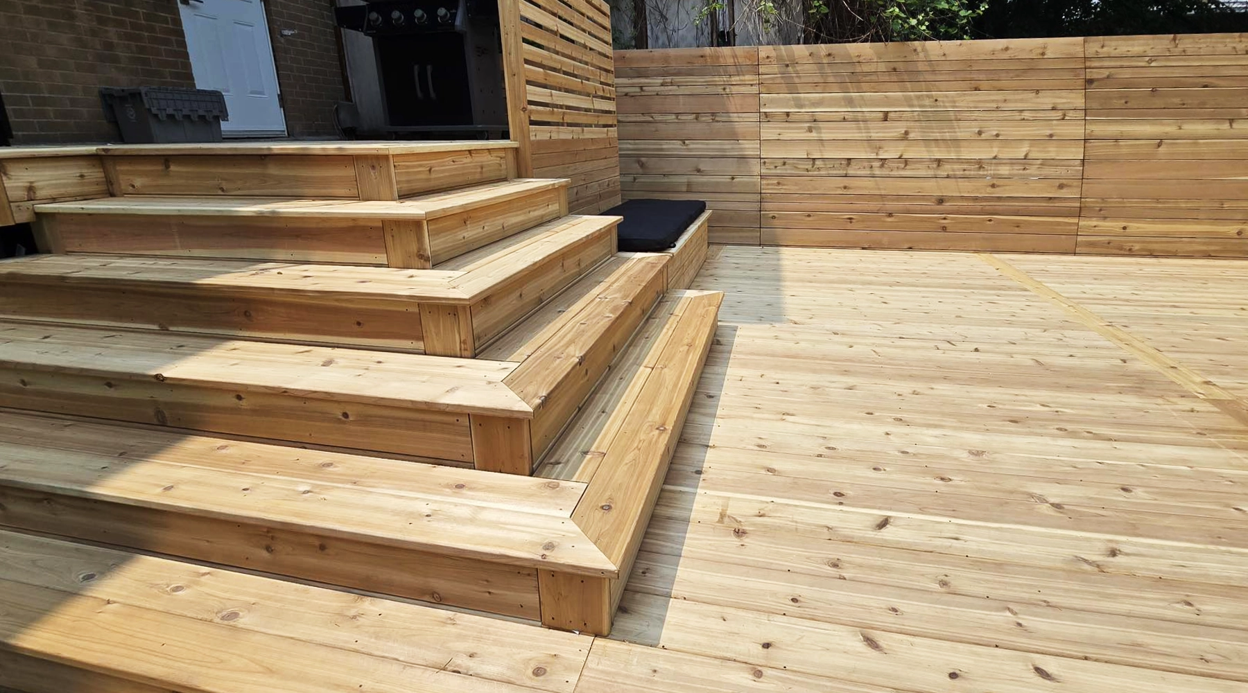 Voici un projet haut de gamme réalisé dans le secteur Ahuntsic à Montréal : un patio multi-palier en cèdre rouge de l’Ouest, construit sur pieux pour une stabilité optimale. Le design a été pensé pour maximiser l’espace avec une grande marche pyramidale, parfaite pour circuler entre les zones, et un spa encastré qui s’intègre directement au patio. L’ensemble est annexé à une grande clôture en cèdre, créant un espace extérieur intime et chaleureux.